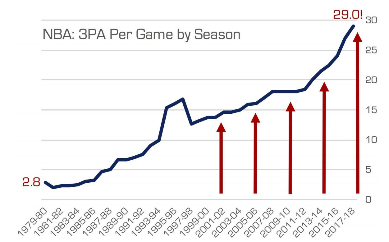 Yet teams are shooting more threes than ever. Analytics prove it’s the most efficient path to winning games. The Pelicans, who take the fewest three-point attempts per game, still shoot 33.3 per game. By comparison, in 2014, the team with the most attempts averaged 26.6.